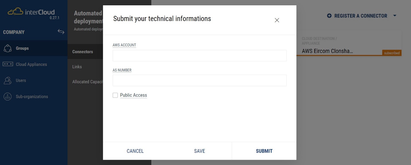Then click on next. Provide then InterCloud with the relevant Cloud Service Provider technical information. Depending on the Cloud Service Provider and the connectivity model, the required information may change:
