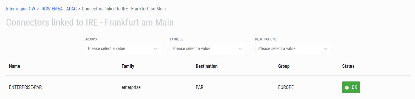When clicking Linked Connectors in Inter-region Gateway Details, the list of Connectors linked to the selected IRE is displayed.