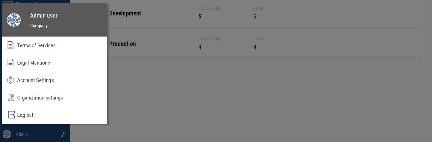 If the user clicks at the bottom on the left blue panel, the Personal Menu appears. The personal menu allows to access: