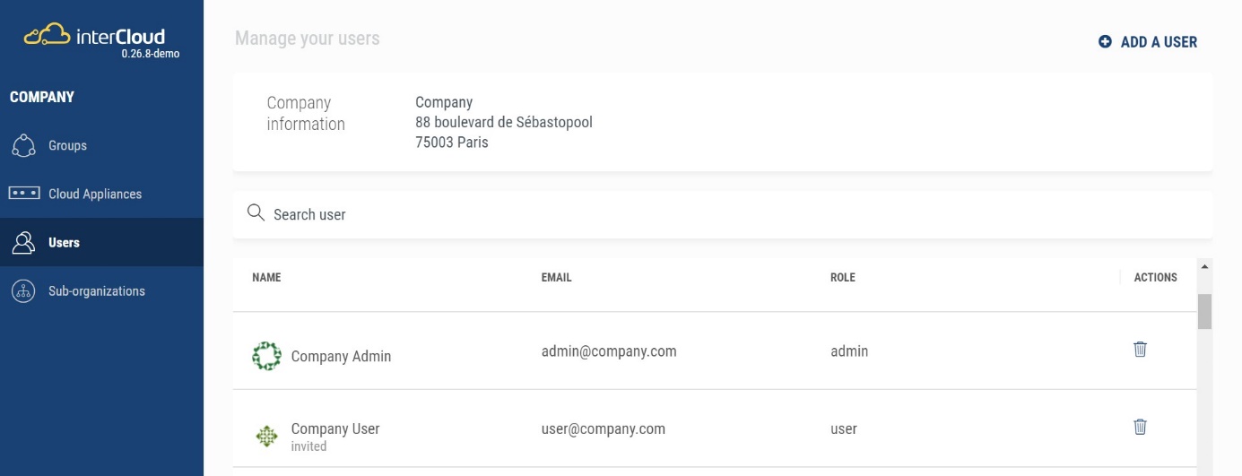 A logged user can access the list of the Users of an Organization by clicking on "Users" in the left blue panel. The user is then presented with: